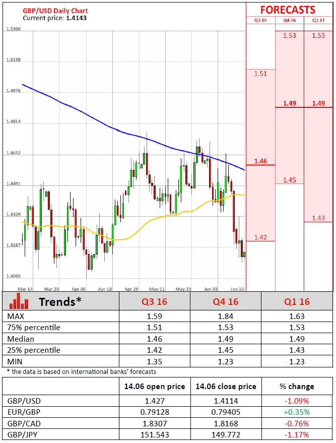 Bank of England policy makers gathers this week amid expectations they will hold off lifting the benchmark interest rate from a record-low 0.5% until early 2017. Britain's inflation has been below the 2% target for more than two years, and the central bank forecasts are for a gradual increase with the rate only returning to the goal in mid-2018. Moreover, there is speculation that borrowing costs could even be reduced to support the economy if Britain votes next week to exit the European Union.