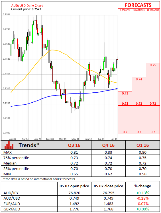 Compared to a healthy print of $1.579 billion deficit in April the current Australia's balance on goods and services equals to $2.2 billion. Meanwhile, a median estimate of economists forecast was a deficit of $1.72 billion. Moreover, Australia's trade deficit has been on a gradual downtrend since the end of last year, mainly due to the weak local currency which pushed export volumes for the resource-dependent economy.
