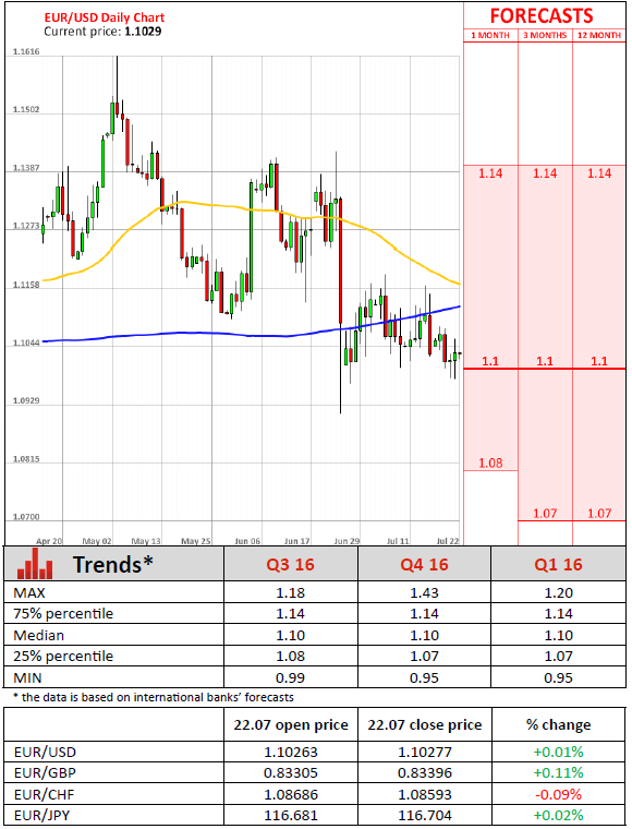 Mario Draghi, President of the European Central Bank, also confirmed that the monthly asset purchases of 80 billion euros may run beyond the current deadline of March 2017, if necessary. Furthermore, the central bank's President highlighted that the governing council may provide more stimulus at its next meeting in September, as new post-Brexit forecasts for economic growth and inflation will be available by that time. Meanwhile, analysts polled by Reuters slashed their growth forecast for the Euro zone to 1.3% from 1.6%, but left inflation projections unchanged at 1.3%.