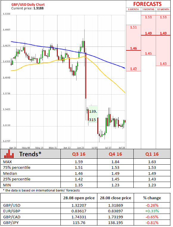 UK GDP advanced 0.6% on a seasonally adjusted basis in the second quarter of 2016, as reported by the Office for National Statistics on Wednesday, surpassing the 0.5% market forecast and the 0.4% rise seen in the first quarter. Economic output expanded in 2 out of 4 main industrial sectors: services added 0.5%, whereas production gained 2.1%. However, construction and agricultural sectors showed a pronounced downward trend sliding 0.4% and 1% respectively. Year-over-year, British GDP increased by 2.2%, above the expected 2% and compared to the 2% reading in the previous quarter. The Pound weakened upon the news release and traded at just $1.311, while the FTSE 100 Index reached its highest level since July 2015 and traded at 6,770 in the second half of the London session on Wednesday. Despite the positive economic outlook provided by the quarterly GDP data, supported by the BoE and the Treasury promises to take all the needed actions to accommodate the economic growth, experts noted that the published results included only one week after the Brexit vote and were largely driven by booming industrial activity in May/June. The overall market forecast for the third quarter was revised down to 0.4%, reflecting the expectations of weakening economy captured by plummeting retail sales and lackluster PMI figures.