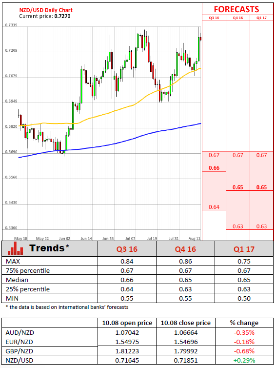 On Wednesday, at the conclusion of RBNZ August monetary meeting the Reserve Bank of New Zealand cut interest rates by 25 basis points, taking the deep of a record-low rate equalling 2%. The decision made by Reserve Bank of New Zealand met market expectations by delivering a rate cut and hinted that more monetary policy easing might be added in future. Nevertheless, some economists still were expecting RBNZ to cut harder, with the Kiwi dollar going down as soon as the decision was announced. Moreover, according to the RBNZ, the annual inflation rate is expected to begin recovering during the last quarter of this year. Also, the RBNZ pointed out, that firm actions could be started until early 2017, hinting the central bank will wait at least some time in order to reassess the necessity of another cut. The officials said the buoyant housing market resumes to pose financial stability risks and promised to consult on stronger macro measures. It is worth to point out, the RBNZ has another challenge alike as the Australia's RBA in lowering interest rates - managing the rising risks of a housing bubble.
