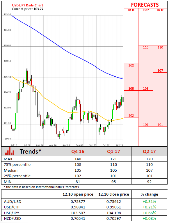 On Wednesday the Fed released the minutes of its September meeting, once again refraining from raising interest rates. Several FOMC members expressed desire to raise rates, while others stated that a rate hike would be required 'relatively soon'. It was the first time in five years when more than two officials voted for an immediate rate hike. Some Fed policy makers still have concerns over the strength of the labor market and inflation, thus, more evidence of US economic growth is required. Inflation has been below the Fed's 2% target, namely at 1.7%, but it was still argued that the levels are quite close to expectations and there are few signs of inflationary pressures.  Some argue that the Fed was somewhat hawkish, but these minutes had little impact on the markets, as they brought more uncertainty, not necessarily suggesting a rate hike will occur in December, despite Fed Chair Jannet Yellen and several other officials stating that they would raise rates by year's end if inflation and employment figures keep improving. Although there are two more Fed meetings scheduled in 2016, a move in November has been basically ruled out due to US presidential elections. According to CME Group's data, a December rate hike is currently seen with a probability of slightly more than 60%.