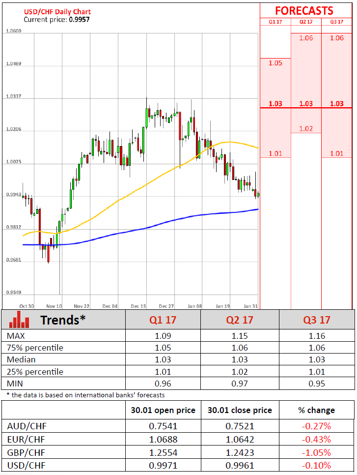 After the release, the Swiss Franc fell slightly against other major currencies, trading at 1.0687 against the Euro, 1.2542 against the British Pound, 0.9989 against the US Dollar and 117.97 against the Japanese Yen.
