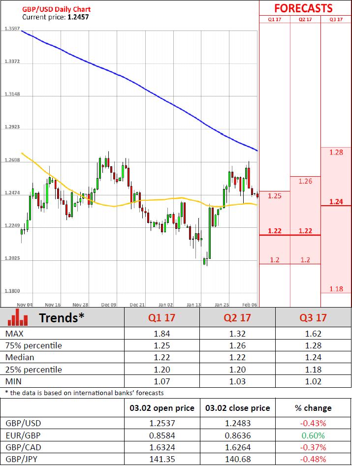 - Daniel Vernazza, UniCreditThe services sector activity in Britain slowed unexpectedly during the first month of 2017, a private survey revealed on Friday. Markit/CIPS reported its Purchasing Managers' Index for the UK services sector fell to 54.5 points in January after hitting 56.2 in December, the highest level since July 2015, when it climbed to 57.4. Market analysts anticipated a slighter decrease to 55.8 in the reported month. Last month's reading recorded the first slowdown in the UK services industry in four months. However, it remained comfortably above the 50-point level separating expansion from contraction. Britain's service industry is closely monitored, as it accounts for almost 80% of the economy. According to the Markit Services PMI survey, companies expressed greater optimism about the future of the services sector. Nevertheless, businesses once again pointed to rising inflationary pressures due to the sharp fall in the value of the Sterling. The weak domestic currency is likely to push inflation to 2.7% in 2018, above the Central bank's target of 2%, the BoE Governor Mark Carney said on Thursday. Although the Bank said its tolerance for above-target inflation would be limited. After the release, the Pound dropped markedly against other major currencies, trading at 1.1630 against the Euro and 1.2494 against the US Dollar.