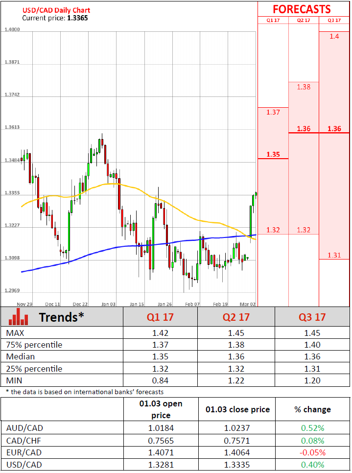 - Mark Chandler, Royal Bank of Canada As markets expected, the Bank of Canada left its key interest rate unchanged at its policy meeting on Wednesday, pointing to significant uncertainties in the Canadian economy. The Central bank acknowledged that the economy probably expanded at a stronger-than-expected pace in the final quarter of 2016 but left its benchmark rate at a record low of 0.50%, saying that the economy remained below its production capacity and inflation growth was driven mostly by temporary factors. The Bank was forced to cut its key rate twice in 2015 in order to cope with a sharp fall in oil prices. The BoC said it would continue to monitor the risks outlined at its January policy meeting. Back in January, the Central bank indicated Donald Trump's presidency as one of the biggest sources of economic uncertainty for Canada. Last month, the US President promised to start "tweaking" the trade relationship between Canada and the US. However, his Wednesday's speech to Congress provided no details on the matter. The United States is by far the largest destination for Canadian products, with over 75% of Canada's total exports going to the US. After the statement , the Canadian Dollar hit its five week low against its US counterpart, as a higher probability of a rate hike by the Fed gave opportunity to the Greenback to climb against other currencies.