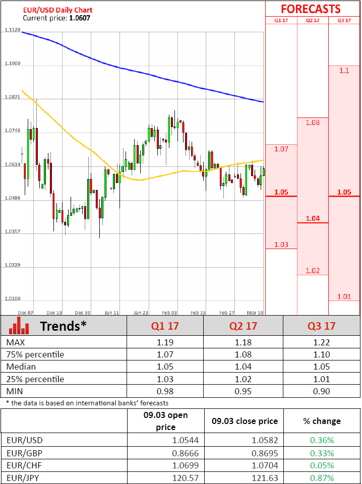 - Mario Draghi, ECB As markets expected, the European Central Bank left its monetary policy unchanged at its meeting on Thursday, saying it would continue monitoring inflation. Regarding non-standard monetary policy measures, the Governing Council confirmed that the monthly asset purchases of 80 billion euros would be reduced to 60 billion euros starting from next month. Policymakers also voted to keep the main refinancing rate at 0% and the overnight deposit rate at -0.4%. The ECB said that its key interest rates would likely remain at present or lower levels for an extended period of time, and well past the horizon of our net asset purchases. After two years of the ECB's QE programme inflation accelerated well above the Bank's initial goal, signaling that the monetary stimulus should be reduced. However, the ECB President Mario Draghi pointed out that the recent acceleration in prices was mainly driven by a rebound in energy prices. Draghi also highlighted that risks related to the upcoming European elections had the potential of slowing the economic recovery in the region. Nevertheless, the ECB raised its 2017 inflation projection to 1.7% from 1.3% in December, adding that the expected pick-up would probably be temporary. Meanwhile, GDP growth projections were revised up to 1.8% from 1.7% in December.