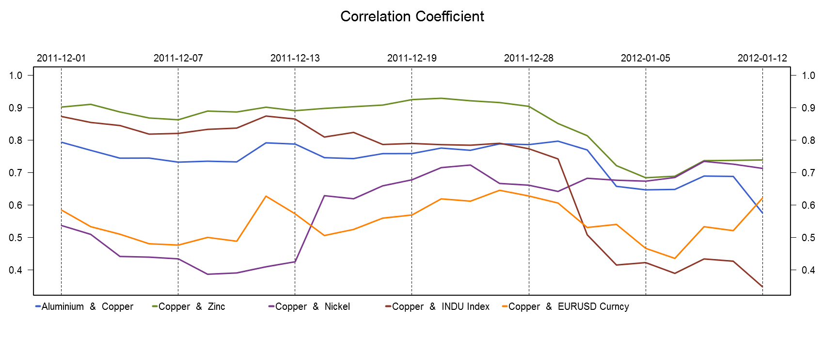 Relations between gold and silver have remained stable for more than one week while gold's correlation with platinum has been falling since the beginning of the week with correlation coefficient declining from 0.91 to 0.77. Gold's tie with palladium tumbled from 0.63 to 0.54 from the beginning of 2012. Meanwhile, gold's correlation with Dow Jones Industrial Average Index decreased to