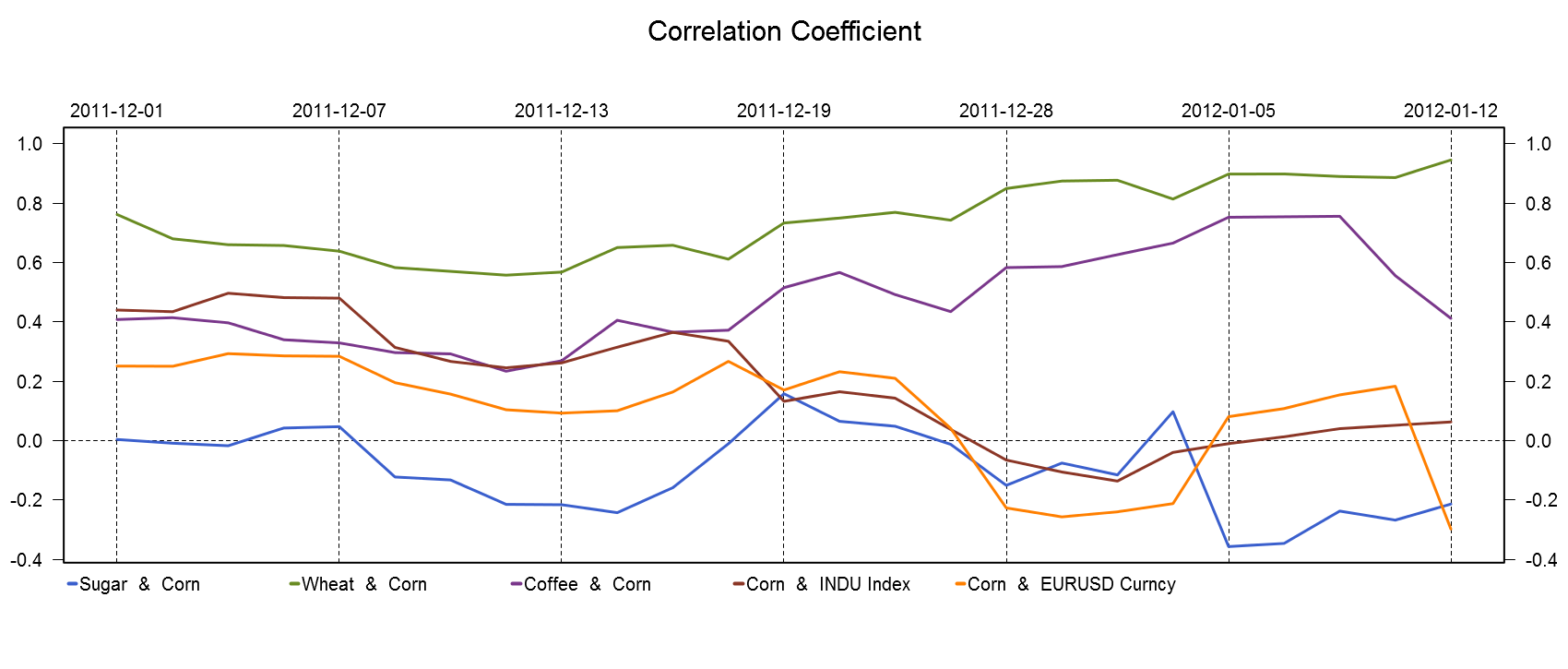 Corn continue to face strengthening tie with wheat as all grain commodities fell sharply after US crop report. At the same time, corn correlation with coffee edged down to 0.41 from 0.75 as coffee price continues to be supported by unfavorable weather forecast in South America. Corn's dependence with Dow Jones Industrial Average (INDU) slightly increased to 0.06 over the day as the stock index also faced losses due to dismal economic data from the US. Interchange between corn and the pair EUR/USD dropped on Thursday from 0.18 to minus 0.30 as the Euro appreciated against the US Dollar on the negative news from the US.