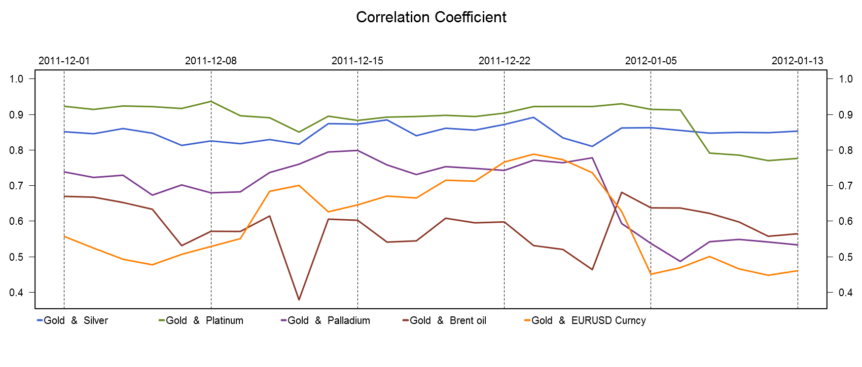 Gold's ties with silver and platinum remained stable over the week while yellow metal's connection with palladium has stayed relatively low at 0.53. Gold's correlation with palladium faced sharp fall since the beginning of the year as palladium tends to move closer to industrial metals and performance of automobile industry. Gold's interdependence with Bent oil stayed at about 0.59 over the week as Brent oil and gold faced stimulus from Iranian and Western economies tensions. Alternation between gold and the pair EUR/USD remains at 0.45 after hitting three-years high in the end of 2011.