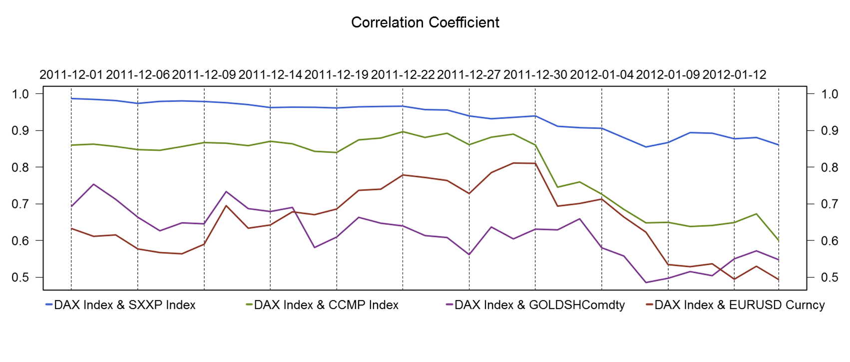 The link between DAX Index and EUR/USD currency pair weakened further, reaching 0.48 in afternoon trade. A rapid downward pattern was observed between German benchmark and Nasdaq Composite (CCMP) as coefficient dropped to 0.6 on Monday. German DAX index faced diminishing relationship with its European counterpart Stoxx Europe 600 Index (SXXP) in the last trading session as the correlation coefficient approached 0.85.