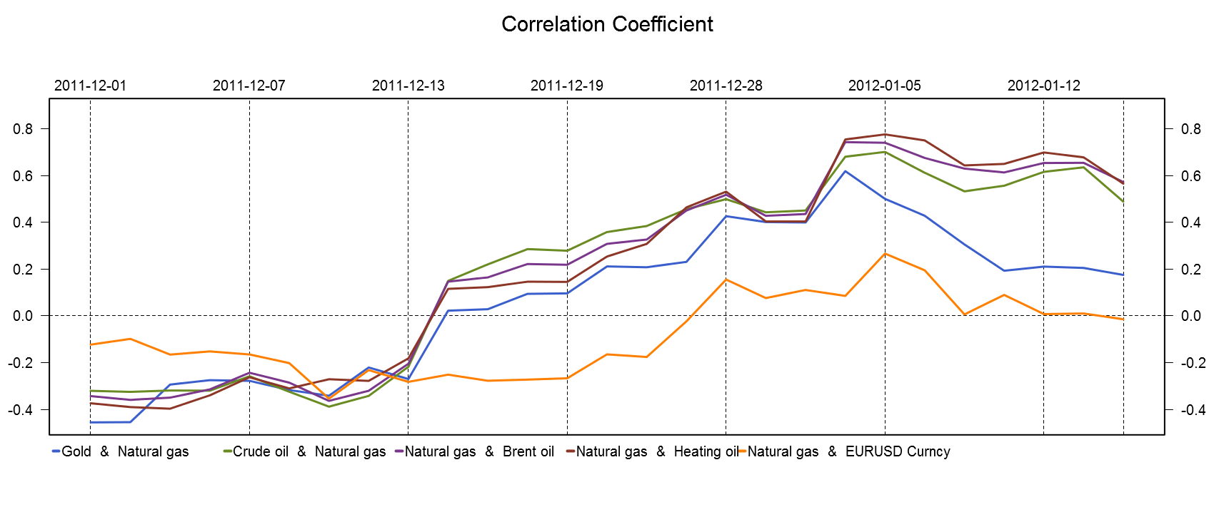 Natural gas faced weakening relations with other energy commodities on Monday as it tends to be more exposed to the mild weather forecasts in the US. Correlation between natural gas and gold was steady at 0.17 as both commodities were under strong pressure; gold was impacted by rallying US Dollar and natural gas by lack of demand due to warm weather in the US. There was almost no link between natural gas and the pair EUR/USD during last week.