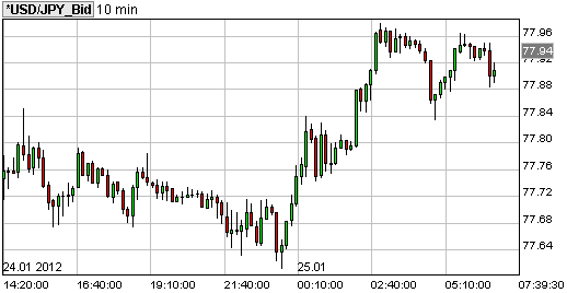 Japanese Yen weakened against its main counterparts on Tuesday after nation's statistics reported Japan in 2011 faced the first trade deficit in 30 years, fuelling concerns about country's economic outlook. Japanese currency lost 0.4% against US Dollar to ¥77.95. Currently USD/JPY is trading at ¥77.91.