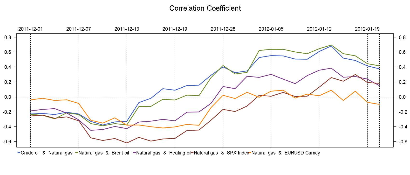 Correlation between natural gas, crude and Brent oil continued to fall on Tuesday as crude and Brent oil price was under strong pressure. At the same time, natural gas link with heating oil inched down to 0.15 amid natural gas production cuts. Natural gas and Standard Poor's SP500 faced almost unchanged relations over the day as commodity and the stock index were supported by positive news from the US. Natural gas connection with the pair EUR/USD fell in the negative area, dropping to minus 0.1 since the beginning of the week.