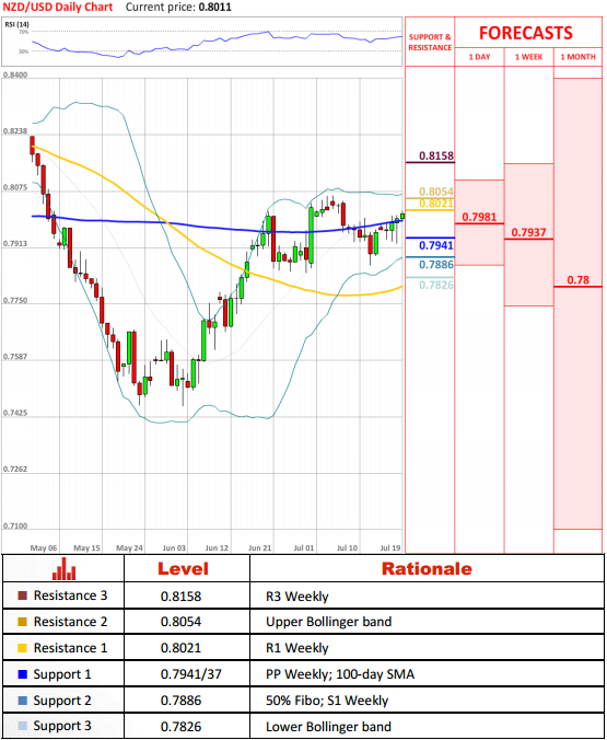 |The New Zealand dollar jumped higher against the American dollar today, trading above the 200-day simple moving average. As bulls currently dominate the market, the level at 0.8021 (R1 Weekly) presents an initial resistance level for market participants. A breakout here would expose next lines at 0.8054 (Upper Bollinger band) and 0.8158 (R3 Weekly), accordingly.|