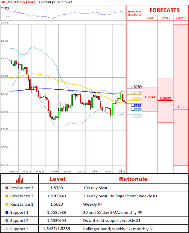 GBP/USD has just confronted a formidable level at 1.5585/83, which should be eroded and then allow further depreciation of the British Pound relative to the U.S. Dollar. Subsequent supports lie at 1.5530/04 and 1.5427/1.5389 and will be even harder to breach, though the pair is expected to regain bullish momentum only near 1.5289/49, consequently, rallies are to remain shallow.