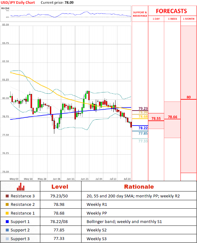 USD/JPY is currently grinding down a support area at 78.22/08, after which it is likely to target 77.85, while a lower level at 77.33 has a much lesser chance of being attained, since in general indicators are neutral. Even though resistances at 78.68 and 78.98 are unlikely to come into play, they will attempt to limit rallies en route to a key zone at 79.23/50, if the present trend is reversed.