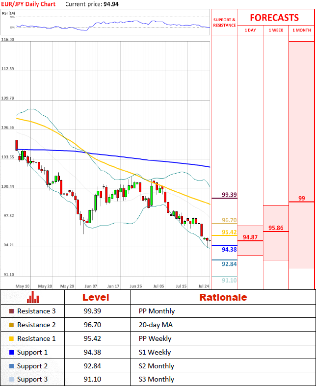 Pair's OutlookEUR/JPY is continuing its slide on weak European fundamentals. The next targets for the pair could be 93.71 (lower Bollinger band) and Monthly S2 at 92.84. In case of a surprising trend change, bullish movements are likely to be tested by 20-day MA at 96.70. However, aggregate technical indicators solely give bullish signals on 1D, 1W and 1M timeframes.