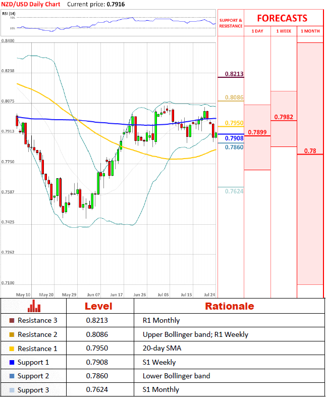 NZD/USD is continuing its movement within a rectangle pattern, and has embarked a bullish direction. The closest targets now are 0.7950 (20-day SMA) and 0.7982 (weekly forecast target). However on the weekly target technical indicators give bearish signals , pushing NZD/USD to the lower Bollinger band at 0.7860.