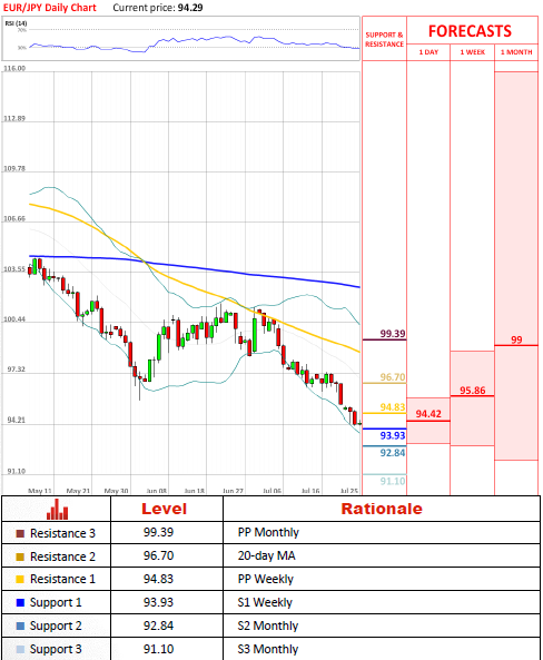 - Gubtram B. Wolff, director of Bruegel (based on NY Times)Pair's OutlookEUR/JPY is on the upside today, attempting to pare yesterday's losses before the pair declines to test the Lower Bollinger band near 93.46. The first significant target for bulls stands at the 20-day MA (96.70). However, in case of a trend change closer to the end of day, we are likely to see a sharp fall towards monthly S2 at 92.84.
