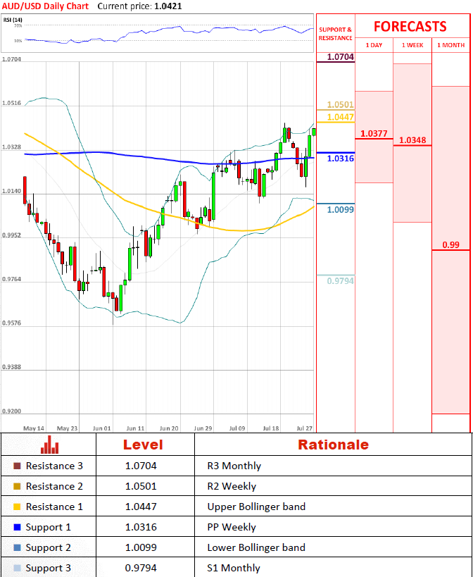 As the pair continues a movement within an upward channel, we observe a strong bullish movement for the third consecutive day. The Upper Bollinger band at 1.0447 could be a strong resistance level for the pair, after which a trend reversal is likely. The targets for the beginning of the next trading week are 200-day SMA at 1.0297 and 20-day MA around 1.0283.