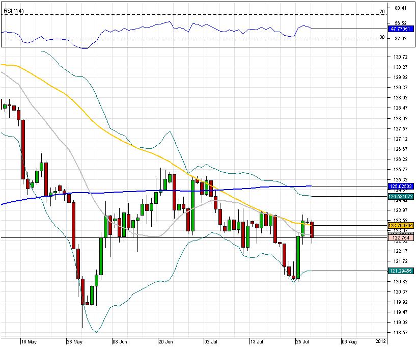 GBP/JPY has seen a sharp rebound from the Lower Bollinger Band on the 26th of July, however this bullish recovery has been stopped by the 55-day SMA, and now the bearish trend is once again in action. Now GBP/JPY currency pair is about to reach Weekly PP at 122.678 and current bearish progression might find support at 121.588 (Weekly S1). In case it fails to halt downward tendency, then next supports at 121.294(Lower Bollinger Band) and 120.776(Monthly S1) might bring some bullish pressure. As for now, RSI indicator remains neutral, meaning that GBP/JPY is neither over-bought nor over-sold for the particular moment.