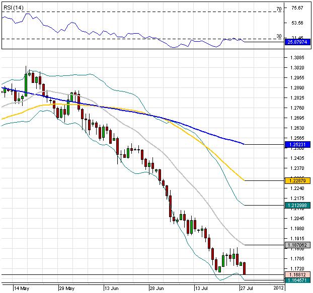 EUR/AUD currency pair continues its bearish tendency that started on May 21th, and now it is gradually approaching Lower Bollinger Band at 1.1645, where EUR/AUD might find support for its ongoing decline. Although this support level seems strong enough to reverse current bearish trend, it still might be breached and then the next support level at 1.1626 (Monthly S3) is very likely to bring some bullish impulse. In addition, RSI indicator already for some time remains in the over-sold area, meaning that the rally may appear any time soon.
