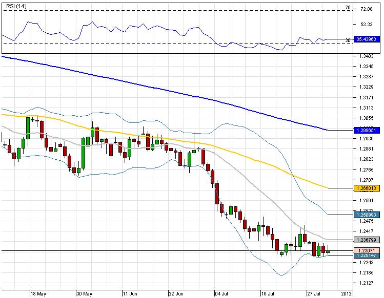 presently slowly approaching a 20-day SMA at 1.2367, where it might find