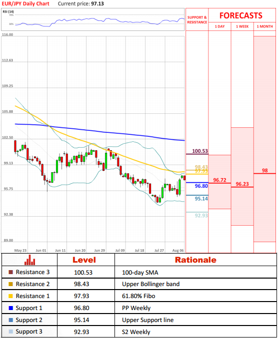 EUR/JPY started a week slightly lower after a strong rally last Friday. If bullish trend holds further, then 97.93 (61.80% Fibo) is likely to be the first target to be tested by bullish investors. If this level is successfully pierced, a path towards 98.43 (Upper Bollinger band) and 100.53 (100-day SMA) will be cleared.