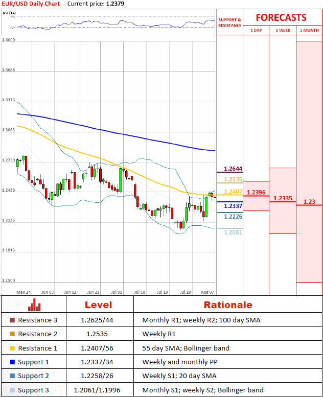 EUR/USD was unable to sustain a rally above 1.2407/56 and is currently headed towards the nearest support level at 1.2337/34. Extension of the dip will encounter 1.2259/26, but it is also expected to give in eventually and thus pave the way to 1.2061/1.1996. In the meantime, if the rallies do occur, they are likely to be capped by a key resistance area at 1.2625/44, thereby preserving long-term bearish outlook.