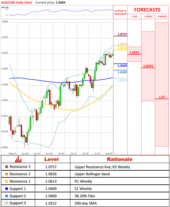 AUD/USD is holding ground right nowslumped lower yesterday, though today is managed to cover some of the previous daily losses while advancing towards 1.0574 (23.60% Fibo). A breakout here would expose the second and third resistance levels at 1.0629 (Upper Bollinger band) and 1.0668 (R2 Weekly), respectively.