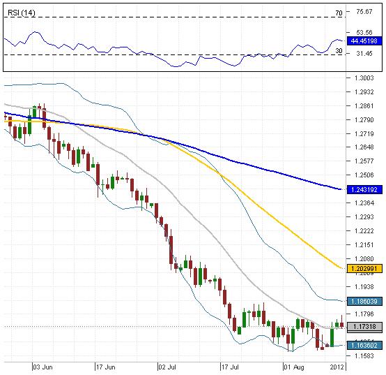 The bullish reaction, which started on August 13th, has finished advancing further, and now the bearish correction takes place. As for now, the EUR/AUD currency couple has already reached the 20-day SMA at 1.1721, and the price is dipping even further -  towards the weekly PP at 1.1670, which might slow down the prevailing trend. In case it is breached, then next support at 1.1636 (lower Bollinger band) is very likely to reverse the downward tendency. Nevertheless, RSI indicator shows neutral signal, therefore the currency pair is neither over-bought nor over-sold at the particular moment.