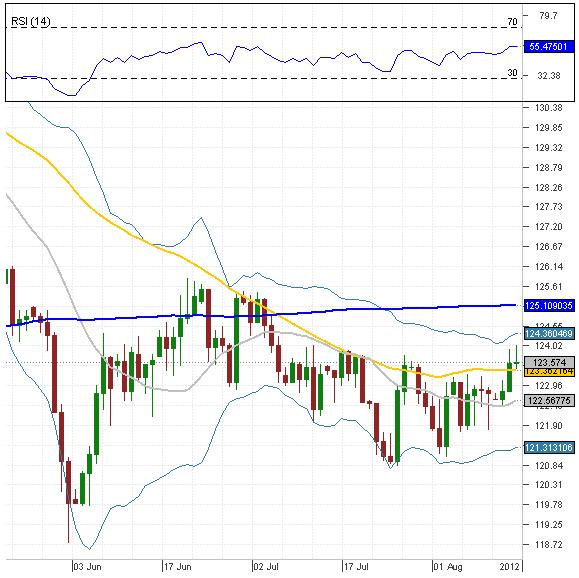 Although RSI indicator shows neutral signal, the bullish breakthrough out of the falling wedge pattern, which occurred on August 13th, continues, and now the GBP/JPY currency pair keeps slowly moving towards the weekly R2 at 124.04, which might bring some bearish impetus. If it fails to stop the bullish reaction, then next resistance at 124.36 (upper Bollinger band) is very likely to change the direction of the present tendency. Current supports are at 123.36, 122.90 and 122.56, and so far there are no signs for them to be breached.