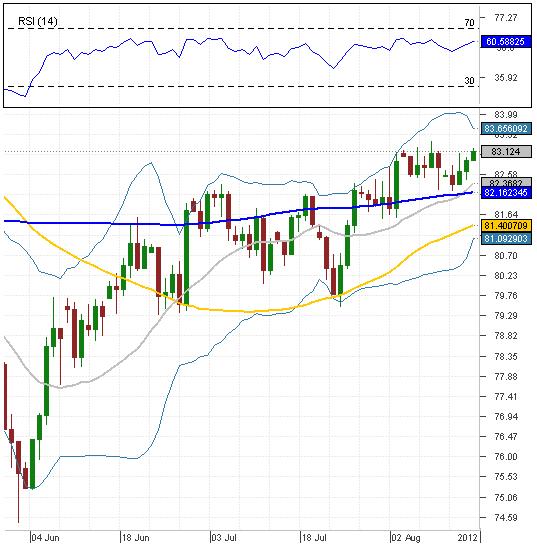 The rally, which started on August 14th, managed to advance even further, and now AUD/JPY confronts the weekly R1 at 83.20, which might change the direction of the prevailing movement. If it fails to stop the rally, then next resistance at 83.65 (upper Bollinger band) is very likely to bring some bearish impulse. Moreover, RSI indicator remains neutral, although it has made a significant move towards the over-bought area. Current supports are at 83.06, 82.72 and 82.36, and so far there are no signs that they might be broken.