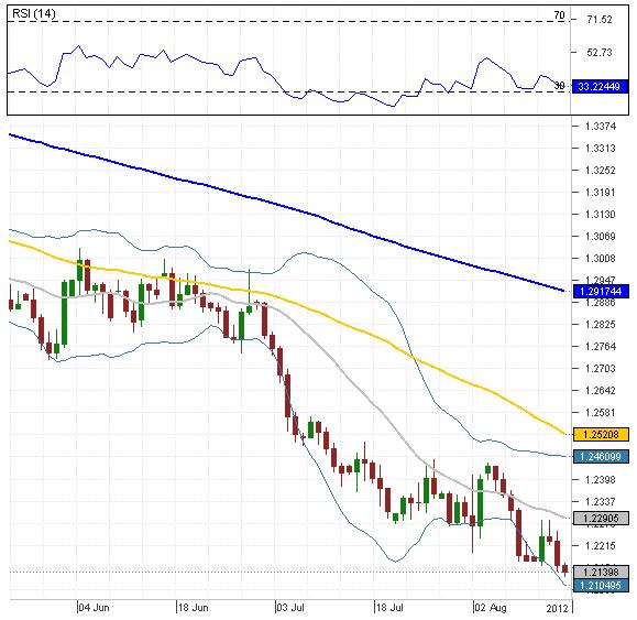 The interim downtrend, which started two days ago, continues, and today the EUR/CAD currency pair is slowly declining towards the lower Bollinger band at 1.2104, which will probably bring some bullish impetus. In case it fails to stop the prevailing tendency, then the price might reach the weekly S1 at 1.2084, which will probably reverse the prevailing downtrend. In addition, RSI indicator remains neutral, although it has made a significant move towards the over-sold area.