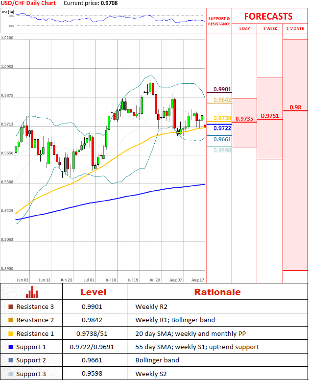 An uptrend support at 0.9722/0.9691 is once again at risk of being breached. Provided it does not withstand bearish pressure, additional support levels at 0.9661 and 0.9598 will become exposed. Nonetheless, the currency may still reverse the short-term tendency and prevent a breakdown of the uptrend buy sustaining a rally above 0.9738/51.