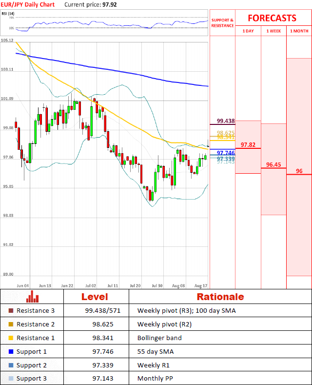 Pair has reached the highest level this week and tested 98.299 earlier in the day, but Bollinger band provided enough resistance to keep the pair back. Pairs outlook remains strongly negative and it is highly likely that the pair will test 97.143 which could pave the way to drop all the way back to 96.5.