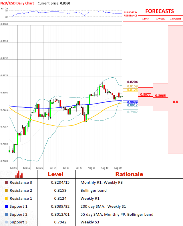 Pair is caught up between Fibonacci retracement levels at 0.8083 and 0.8074 keeping its outlook neutral. Pair should remain deviating between weekly R1 at 0.8124 and 200day SMA at 0.8039 for the rest of the week.