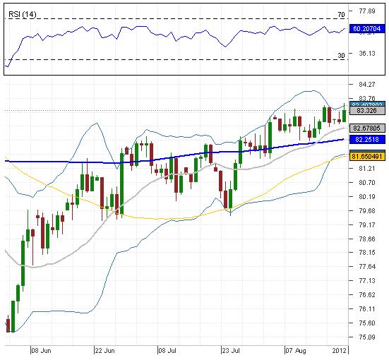 OutlookThe bearish reaction, which occurred yesterday, failed to continue, and now the bullish trend is in action. The AUD/JPY currency pair already managed to breach monthly R1 at 83.06, and now the price is facing the upper Bollinger band at 83.49, which might bring some bearish impulse, however, if it fails to reverse the uptrend, then next resistance at 84.18 (weekly R2) is very likely to reverse the prevailing tendency. In addition, RSI indicator shows neutral signal, and present supports are at 83.06, 82.67 and 82.25, and they seem to be secure for now.