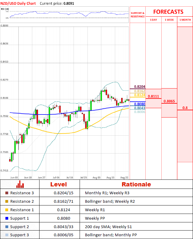 After peaking yesterday Kiwi is fulfilling expert predictions and is staying closer to 80 US cent mark. It is likely pair will attempt to advance above 81 cent mark, but we can observe quite a few resistance levels above that mark which should contain the pair in 80-81 cent boundaries.
