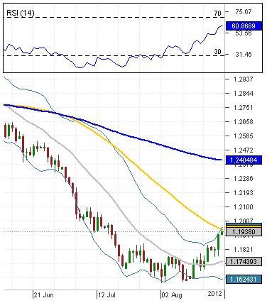OutlookYesterday's bullish movement managed to reach and overcome the monthly PP at 1.1911, and today the EUR/AUD currency couple continues its rally. As for now, the price confronts the upper Bollinger band at 1.1965, which will probably bring some bearish impetus. In case it fails to stop the movement upwards, then next resistance at 1.1987 (weekly R2) is expected to reverse the prevailing tendency. In addition, RSI indicator shows neutral signal, therefore the currency pair is neither over-bought nor over-sold at the particular moment.
