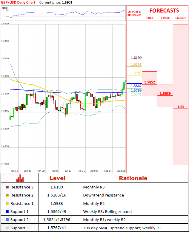 After finally piercing 200 day SMA the cable surges further. The only resistance that separates the price from a major downtrend resistance line (1.6103/16) is at 1.5983 and is unlikely to hold GBP/USD for long, even though mostly technical indicators' signals are form neutral to bearish at the moment. Supports at 1.5862/49 and 1.5824/1.5796 should limit possible dips in the meantime.