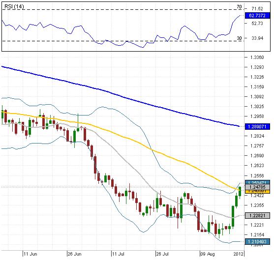 The uptrend, which started three days ago, successfully continues, and today the EUR/CAD currency pair has already managed to break the 55-day SMA at 1.2454. As for now, the currency couple is heading towards the upper Bollinger band at 1.2502, which is expected to stop the uptrend, however, if it fails to change the prevailing tendency, then the price might advance further towards the next resistance at 1.2727 (monthly R1). On the other hand, present supports are at 1.2454, 1.2357 and 1.2282, and they seem secure for now.