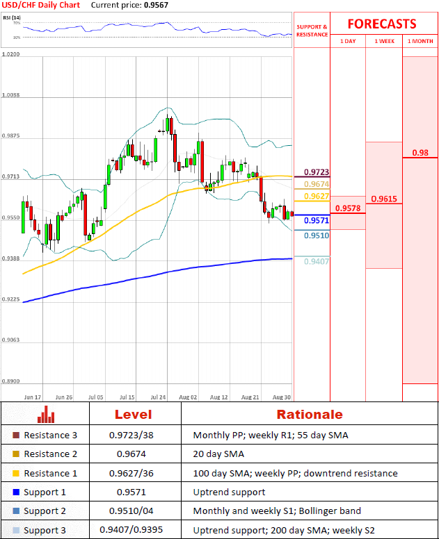 USD/CHF is anticipated to continue descent after a breach of 0.9577 and then to meet a subsequent support at 0.9510/04, which might slow down the pair, but is unlikely to prevent it from reaching a key area at 0.9407/0.9395. There the price is assumed to receive bullish impetus and to advance at an accelerated pace at least at the beginning of the move.