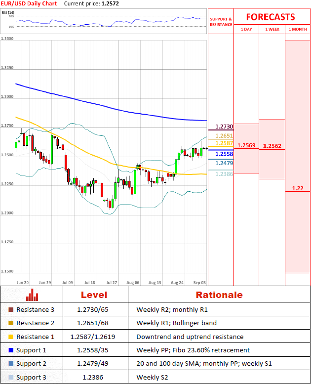 Despite a pronounced rally of EUR/USD on August 31, selling pressure that has come into play at 1.2587/1.2619 managed to negate bullish impetus and halt advancement of the currency pair. However, the price did not bounce off the downtrend resistance towards 1.2558/35, but remains near 1.2587/1.2619, and thus the upside risk increases, though most of the technical indicators give "sell" signals.