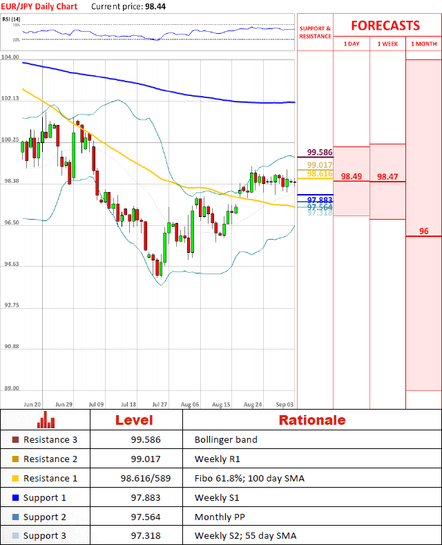 EUR/JPY is continuing to trade in tight range and is likely to be kept below 99 mark as quite a few significant resistance levels are around 98.6. It is much more likely that pair will rebound and test markets reaction while depreciating as the closes major support level is quite a bit below 98.