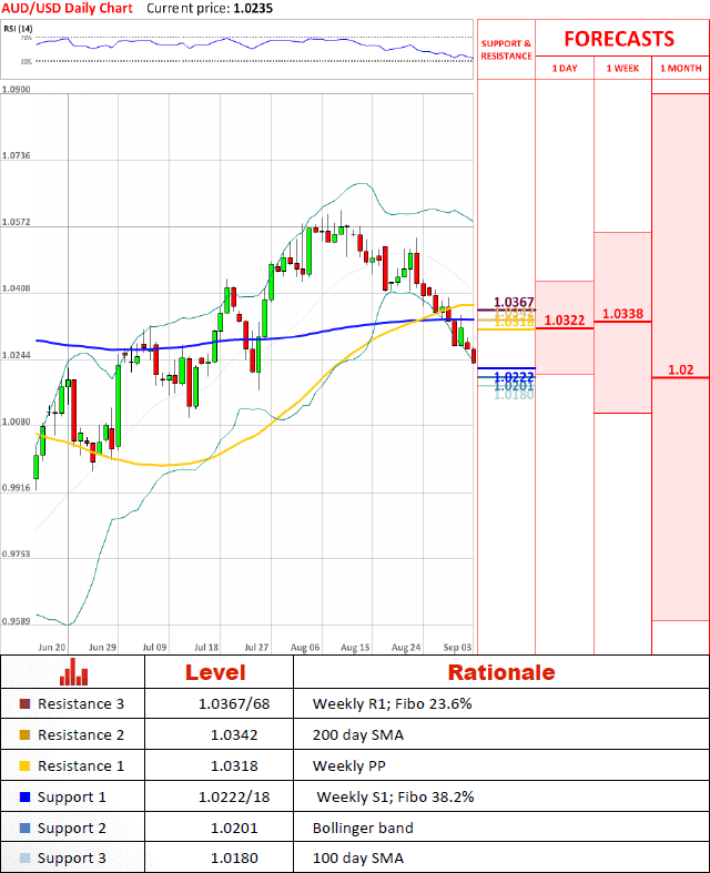 Aussie regains momentum and depreciates further. Stochastic indicator suggest that we should see a an attempt to pull up soon, and as pair is approaching cluster of support levels around 1.02 it is highly likely that pair will slow down for some time.