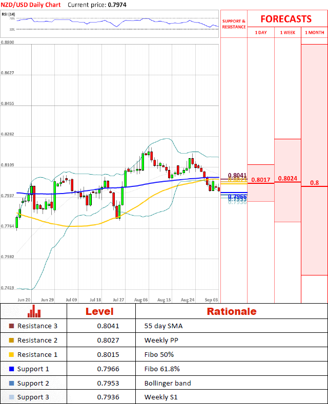 Pair slows down after fully forming Double Top pattern. Pairs outlook is neutral and pair should remain between 80 and 79 cent marks. However, stochastic indicator suggests that pair might try to advance above 0.8 what should not last long.