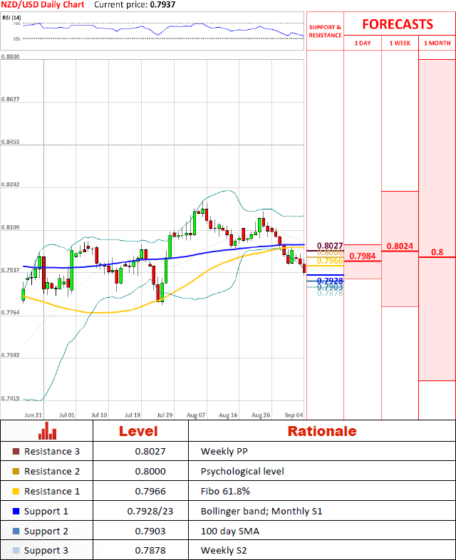 Kiwi is continuing to lose ground against greenback after forming a Double Top pattern, but as pairs outlook remains positive in the medium term it is likely that Bollinger band and monthly pivot at 0.7928/31 will provide enough push for at least a temporary recovery of the pair.
