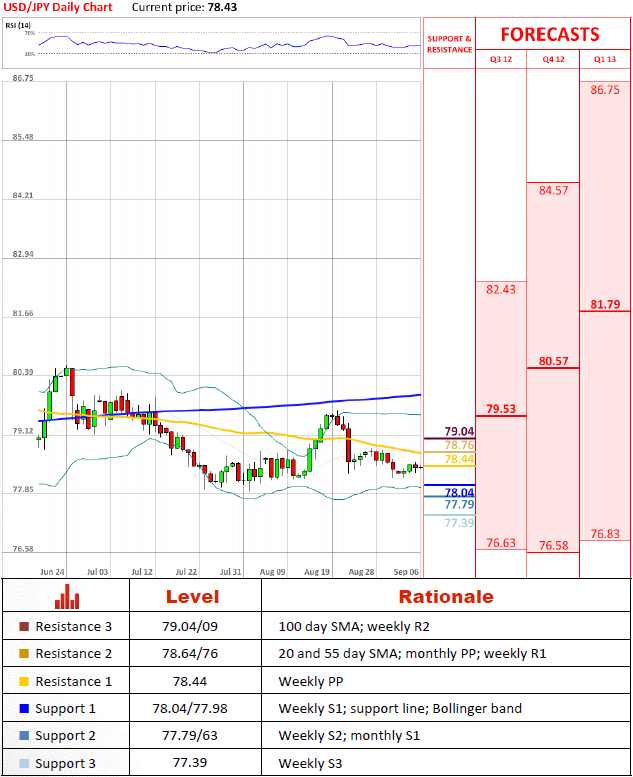 Neither bulls nor bears currently appear to be capable of moving the currency couple, resulting in absence of any activity of the pair since August 23. Still, a decline to 78.04/77.98, likelihood of which has increased according to the signals of most of the technical studies, might trigger a bullish motion, which in turn may evolve into a prolonged rally—above a downtrend line at 79.34/38 en route to 81.62.