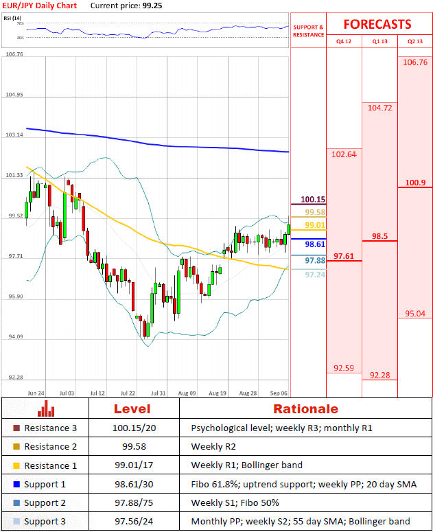 The currency pair has effortlessly pierced through a confluence of resistances at 99.01/17 after confronting an uptrend support line, but was stopped by 99.58, and is currently pulling back, implying lack of bullish impetus. The rally looks fragile also due to a strongly bearish signal by technical indicators for a weekly time frame, therefore a downside risk continues to increase.